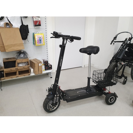 Trottinette électrique ZT16 de Veleco pour seniors, personnes âgées et handicapés. La seule trottinette trottinette électrique avec marche arrière. Avec ses 750 watts, elle pourra parcourir tout type de chemin. Trottinette électrique ZT16 de Veleco pour personnes à mobilité réduite. Vitesse de 12 km/h et autonomie de 30 km. La trottinette dispose de 3 roues pour un parfait équilibre sans béquille, elle dispose d'un panier et le siège est réglable avant/arrière et haut/bas. Dimensions entre les 2 roues arrières : 68 cm (tient parfaitement en équilibre)