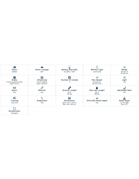 Pour ceux qui souhaitaient une assise encore plus confortable, le modèle GRAVIS surprend également avec cette fonctionnalité. Désormais, les très longues randonnées sont non seulement élégantes mais encore plus agréables qu’avant. Quelles sont les autres fonctionnalités impressionnantes ? Piles et chargeur inclus Affichage LED Compteur de vitesse et odomètre Démarrage progressif Rangement verrouillable sous le siège et boîte de verrouillage Jantes en aluminium Marche arrière, Frein de stationnement Fauteuil réglable Feux de détresse Rétroviseurs Suspensions avant et arrière Éclairage complet Position du siège réglable chargeur USB Porte-gobelet, Poignée shopping